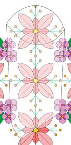En las mangas pasa exactamente lo mismo que te acabo de explicar, al igual que el cuerpo estás tienen forma cilíndrica. La costura lateral, la que queda entre los costadillos, no suele estar encarada en ningún jubón. Al cortar las mangas existe un truco que, a pesar de que no consigamos que los centros de las flores queden justo en las costuras, espejando las dos hojas de la manga, podemos dejar esta costura la mar de aseada a diferencia de la costura lateral del cuerpo, ¿por qué? Pues porque ambas hojas de la manga son simétricas, pero el delantero y la espalda, no.